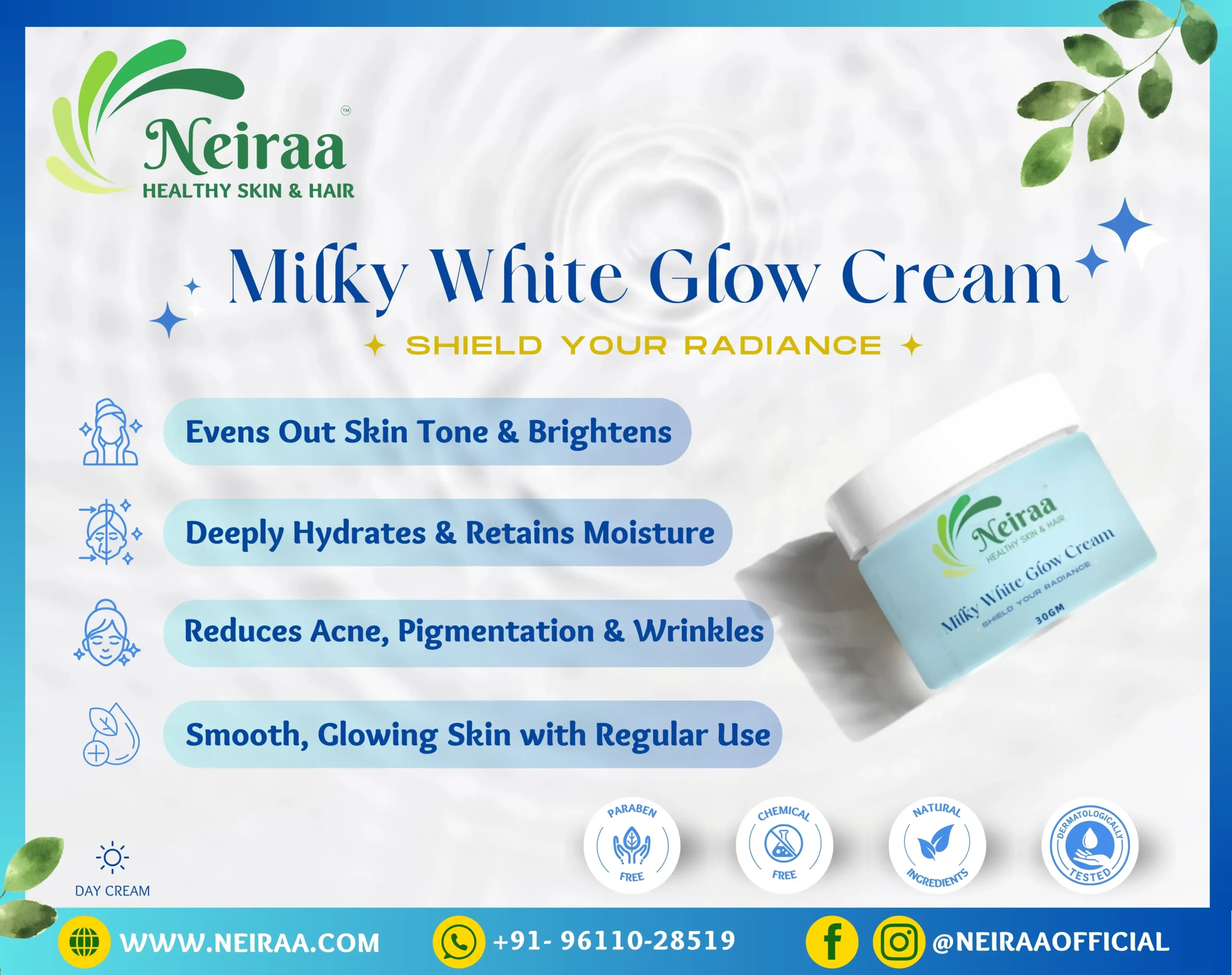 Product Description : Milky White Glow Cream is an effective DAY cream, which acts as shield to sun rays. Protecting skin from harsh UV rays and also makes skin glow. Works in combination with Avocado Pigmentation Repair cream and keeps the skin smoother, happier and healthier.